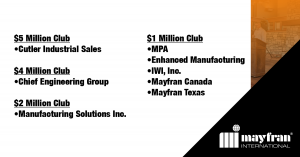 As for the awards, Cutler won the Dealer of the Year Award, Filtration/Chip-Processing Dealer of the Year, and earned membership in the $5 Million Club. They received the most awards this year with three. Chief Engineering Group finished with two awards, reaching the $4 Million Club and winning this year’s Aftermarket Dealer of the Year award. Mayfran Texas won this year’s Machine Tool Products Dealer of the Year award and earned membership in the $1 Million Club. Mayfran Canada won Material Handling Systems Dealer of the Year and was a part of the $1 Million Club. Manufacturing Solutions Inc. earned membership in the $2 Million Club. MPA, Enhanced Manufacturing, and IWI Inc. each achieved membership in this year’s $1 Million Club.