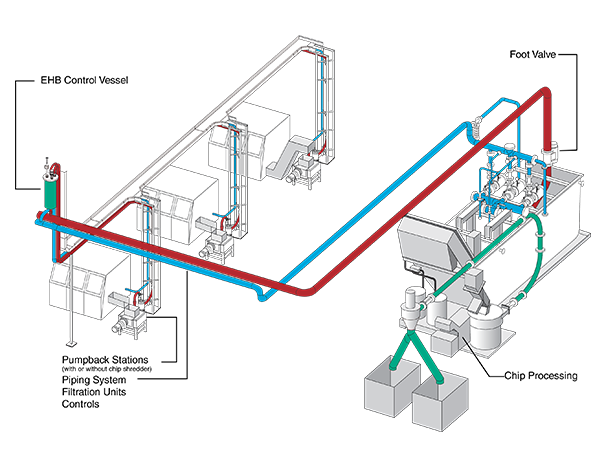 Mayfran’s Viavent® overhead pump system is a closed-loop system for the automatic recirculation of chips and coolant from machine tools in central filtration systems. The modular overhead design provides maximum flexibility in initial installation and future expansion because the machine setup is not dependent on floor space and ceiling height.