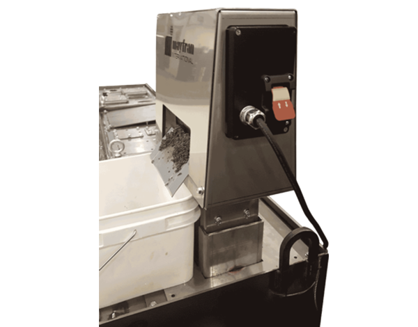 Ideal for steel, cast- and ductile-iron applications, the Mayfran auto sludge barrier is a motorized automatic magnetic separation unit that removes small ferrous chips, fines and tramp oils from the coolant tank. It prevents in-tank sludge buildup while simplifying recovery and disposal without troublesome manual operations. It can be easily retrofitted into any coolant tank and mounted near pumps to reduce particulate sent back to the machine or mounted next to the conveyor to remove ferrous particles as they exit the conveyor.